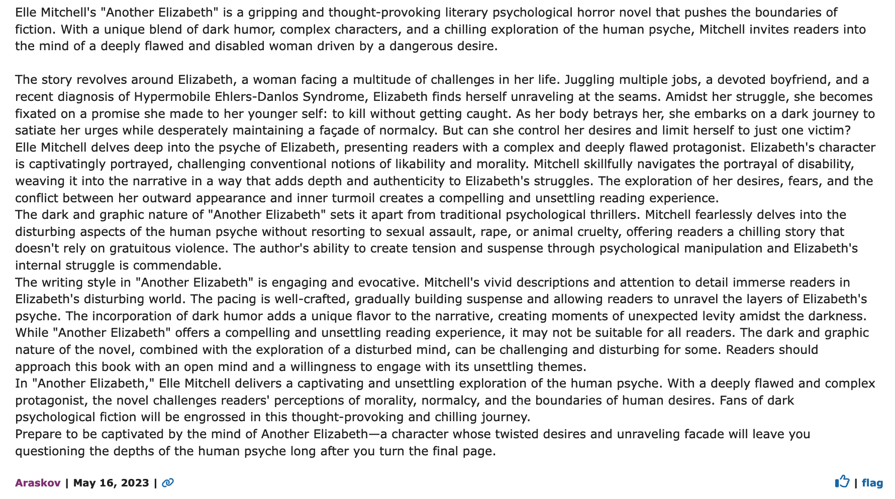 "Another book that throws you right in the middle of things from the start. Elle Mitchell does a really good job of pulling you in and making you sympathize in way you probably never thought possible. The writing reminds me a bit of American Psycho with the short and to the point, matter of fact sentences. It really captures the inner thought processes [of] the main character.” —Reviewer on LibraryThing“