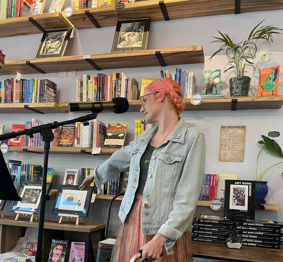 It was a dark way to start a reading, talking about painful periods. But hi, hello, that’s my brand, I guess one could say. Dark, disabled, and startling? Dark, disabled, with a splash of peach? Dark, disabled, with a side of sweet? Something like that.
