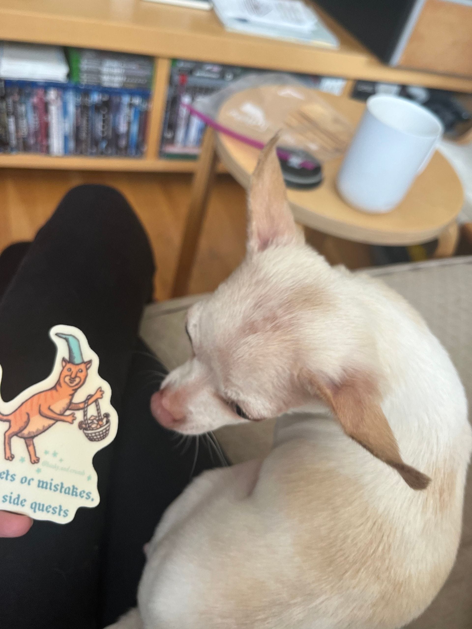 - There is an unexplainable amount of care and thoughtfulness in this photo. With the smushy pup named Charlie who needs to be close to me the whole time I’m at Friend #1’s home. With the sticker given to me by Friend #2 (not present during the gifting)—also is my friend’s girlfriend. With the caveat that Friend #1 would have bought it for me had Friend #2 not done so (they were together at the time). With two lovely souls thinking of me at the same time. I mean. ❤️