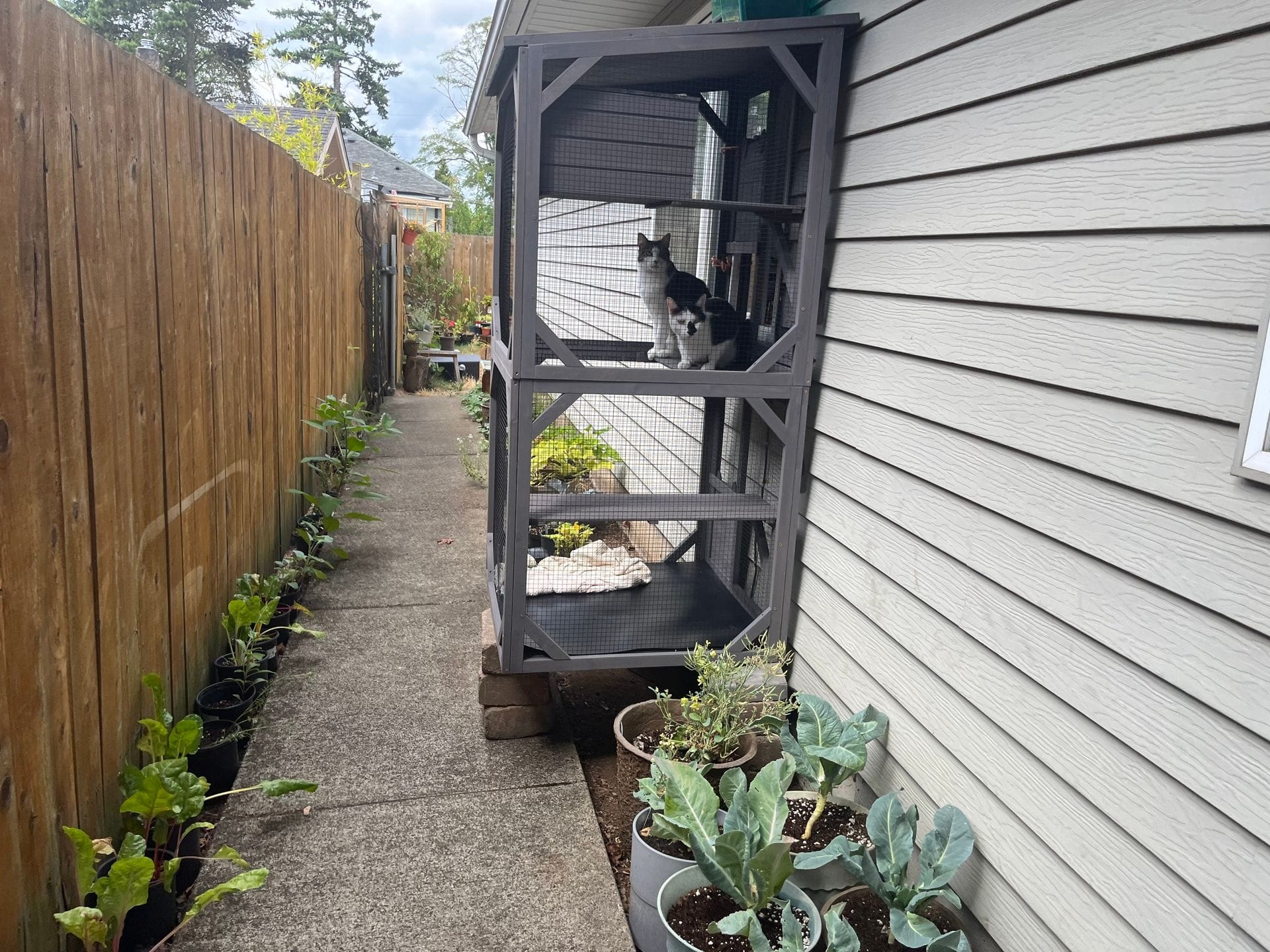 - The Smalls enjoying their cattery as the hubs and I walk to and from the backyard, hearing them as they chat to squirrels, look for them before we go somewhere, only to find them asleep in the little box. Joy.