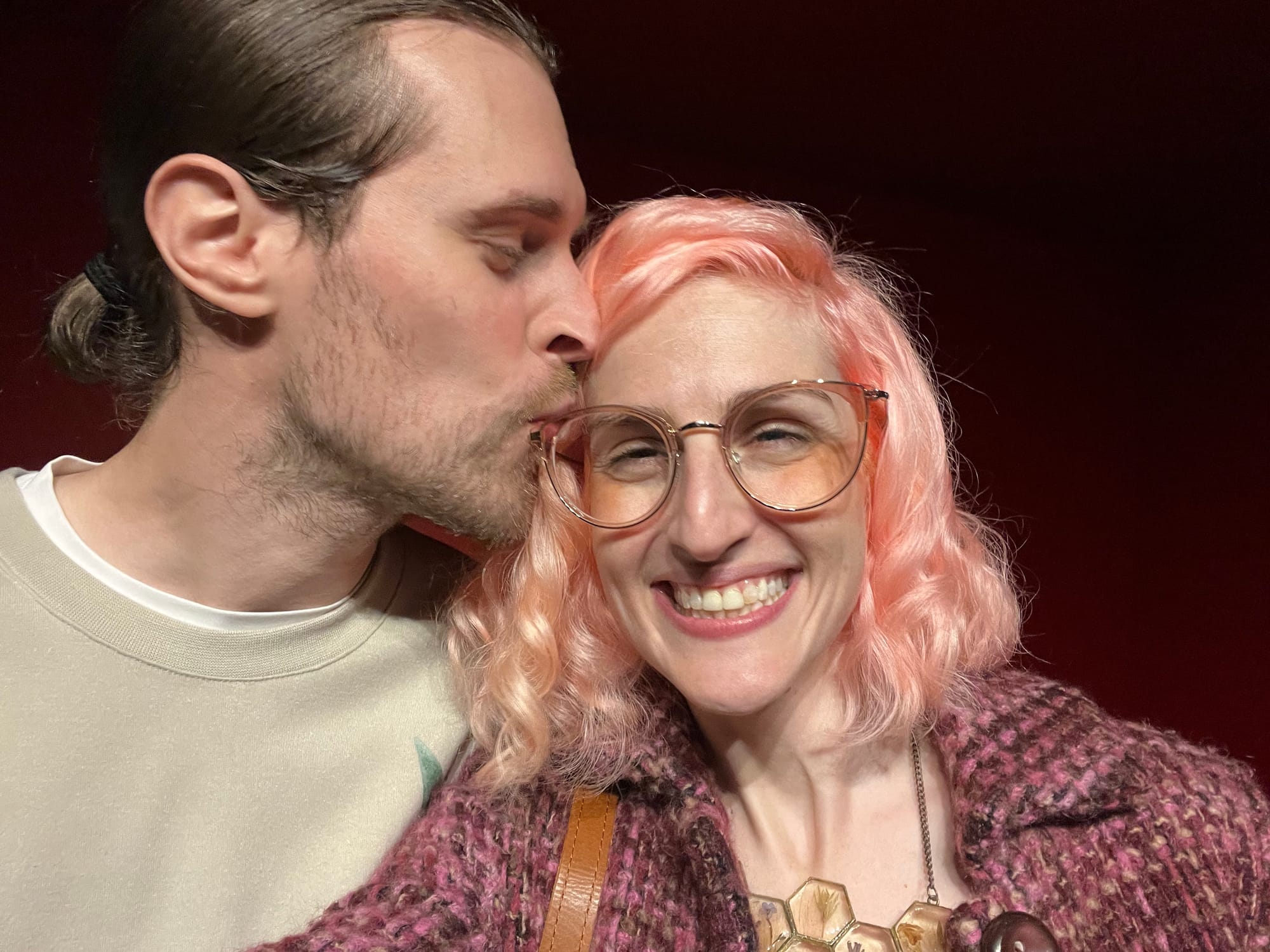 Top to bottom, left to right: 1. Closeup of fused glass lantern with me reading in the background / 2. Me reading Joyce in public for the first time with the embroidery from the cover behind me / 3. Another side of the fused glass lantern with me reading in the background / 4. Another side of the fused glass lantern close up / 5. Me after a long night with the hubs (Wesley Mitchell) kissing my head / 5. The final side of the fused glass lantern with me reading in the background / 6. The hubs (Wesley Mitchell), a friend, and me laughing / 7. Erin Hall, a friend, me, Rose Wilde Hall, Angelique O'Rourke | *named people are authors I've published in anthologies—check em out